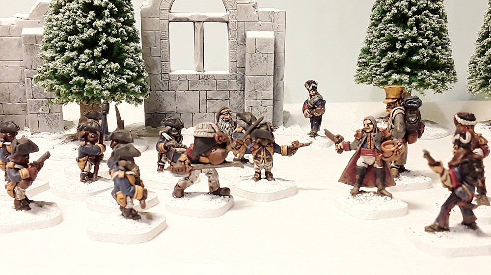 For the Pugs I use the stats for Dwarf Regular Infantry as is recommended for Von Mohnblume Ostarian Pug Infantry. They have a Lieutenant (second) armed with a sword and standard pistol, a sergeant with a halberd, a standard bearer, a drummer and the troopers are all armed with Dwarf MkII Muskets.