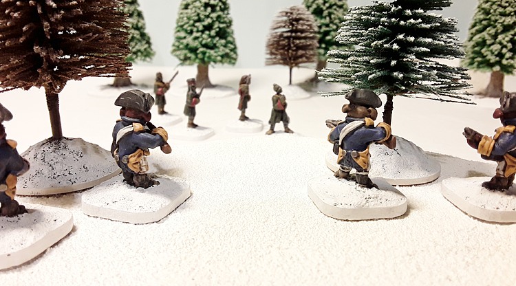 Special deployment: To play an ambush scenario with the Pugs concealed in the snow I use round counters to represent the Pug force lying in wait (I put a number on the underside so that I know which is which but my opponent doesn’t). They count as in heavy cover until they fire or move, or until they are hit by enemy fire or charged. This is to represent how well they are hidden rather than the protection given by the snow itself!