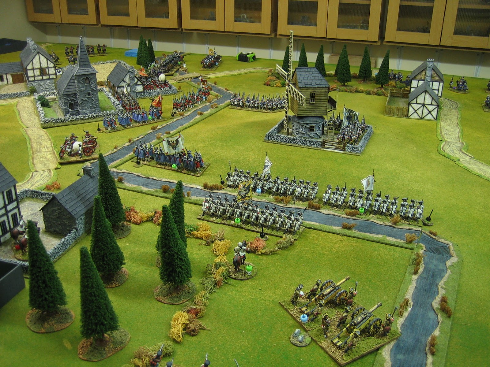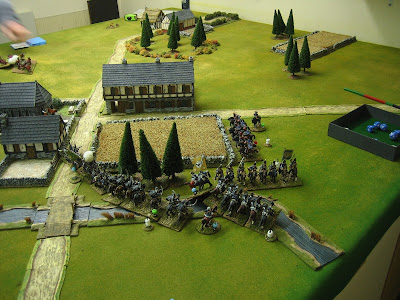 Note the Prussian Guard infantry holding the windmill. In most games this unit gets clobbered but this time it did sterling work. It has stormed the hill, thrown the Grenzers out of the windmill (both units were routed early on) and is now peppering the Austrian line infantry at the stream.