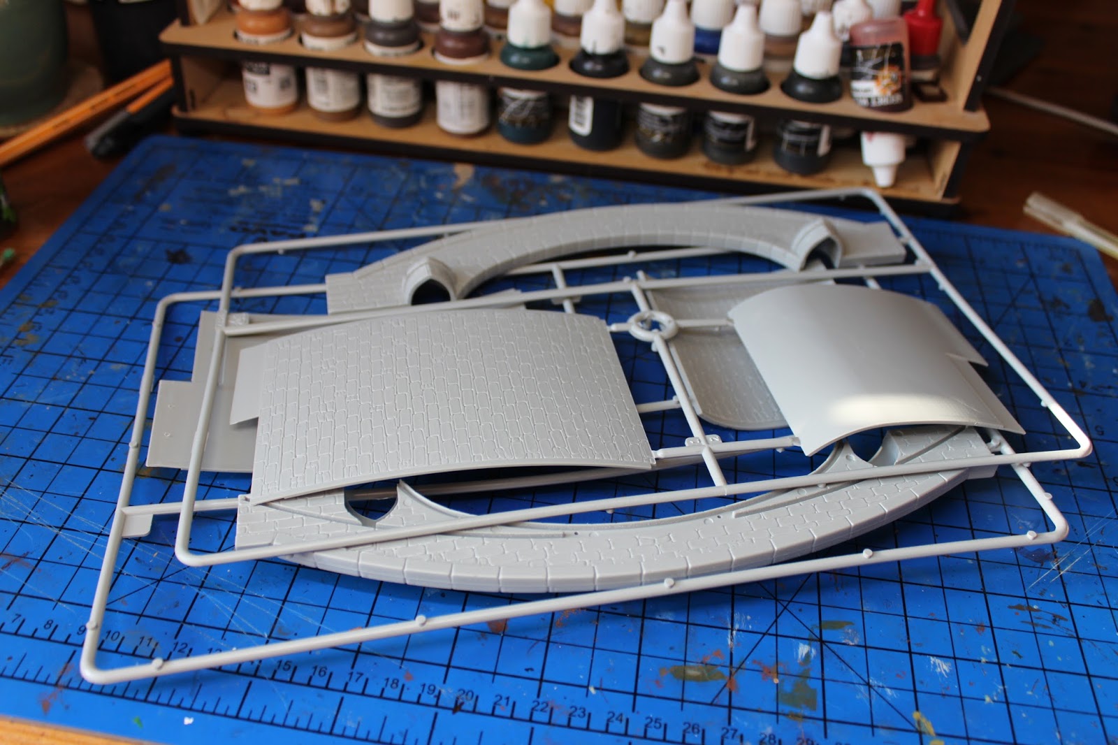 Having completed the river, I was reminded that I had picked up was once an Italri stone bridge in the ‚Warlord Games‘ half price plastic sprue sale. Simple enough to glue together, but once I had slapped some grey paint on it, I was left feeling a tad underwhelmed with an incredibly clean bridge. A bit of weathering was called for and with the addition of some pumice gel and static grass I was able to create something that fitted more readily with the completed river sections.