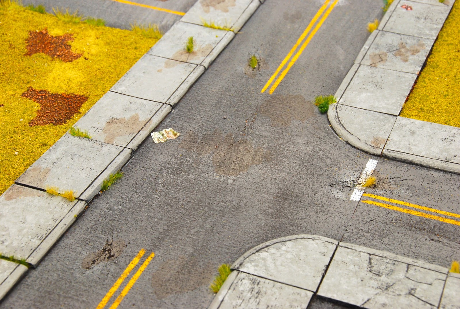 Here is the intersection. The yellow lines REALLY went a long way towards „finishing“ the board… a bit of painters tape and voila! The only thing I didn’t include was the white lines along the sidewalk… I don’t think I’ll go back and add them, although I will likely go back and touch up the black lines of the sidewalk cracks and the like.