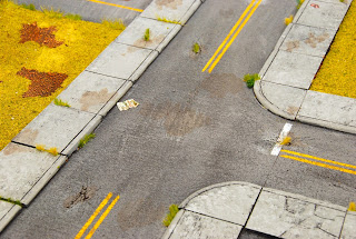 Here is the original as I was doing work on it. The sidewalks are made of balsa rectangles, with the curbs and cracks etched in using a pen. The concrete and asphalt areas are done with cork-lined contact paper, and the grassed areas are sanded and then flocked.