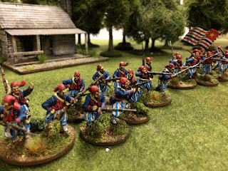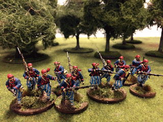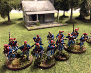 My 8mm playtest minis did work but sins I like 28mm I had to paint me some for the Playtesting of the Rebels and Patriots rules. My matey Jesper was working on some Union so I got me a box Perry Plastic Zouave minis and started on a Confederate force.