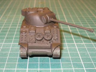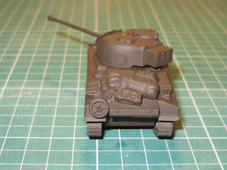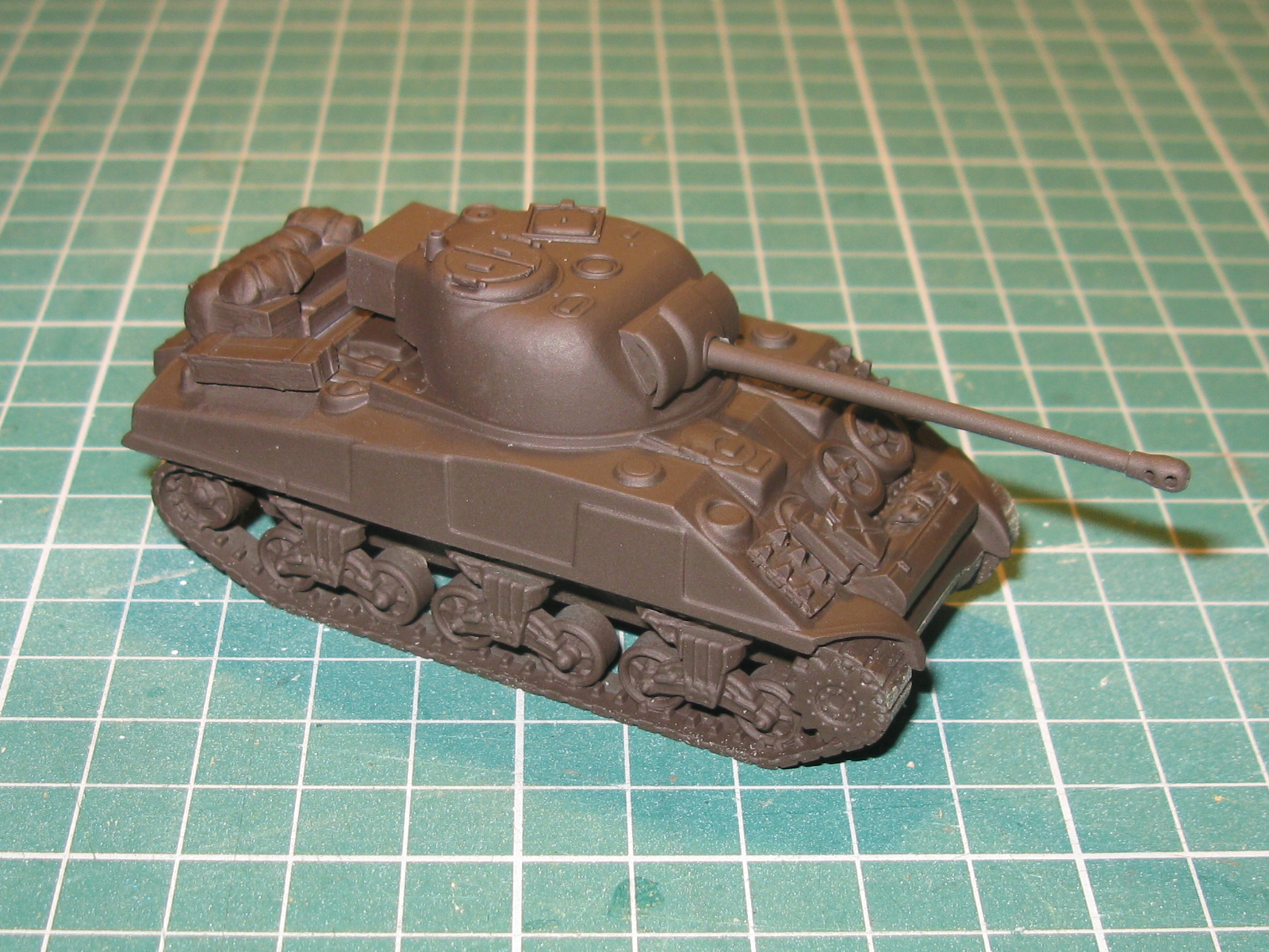 I put together a Sherman Firefly for my 7th Armoured Division troop yesterday, using the Armourfast kit as the basis but cutting off the sand skirts for a more appropriate appearance. The Armourfast kit is based on the M4 not the M4A4 (Sherman V) but you can’t really tell the difference if your not a tank rivet counter. The sand skirt removal is a bit of a pain but not too difficult, once you’ve cut away the plastic and scraped it down, requiring only a bit of sanding to get the profile right. The stowage is a combination of resin pieces and white metal parts, along with some spare road wheels from an old Italeri kit. I’m quite pleased with the end result…although I wasn’t so sure half way through!