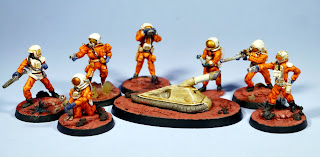 Mark went with a cold white colour for the armoured space marines and a warmer orange for the ones in light space armour giving his work a tone of movies such as Moonraker which went for a hard science fiction take on combat outside the atmosphere. As you can see there is quite a size difference between the different armour grades making for a nice contrast. Here is a listing of all the codes: