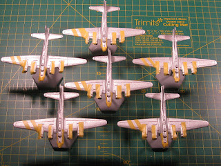 I’ve spent most of today at my daughter’s rugby tournament in Alton but got back at about four this afternoon, giving me some time to mask up the B17G’s for the next stage of painting. This involves both the olive drab anti-glare panels on the engines and nose, together with a 3mm wide diagonal unit stripe in black on the starboard wing. I could use decal strip for this but it’s probably easier just to paint it then tidy up the edges afterwards. I’ll try to get some paint on these tomorrow, if I get back home at a sensible time.