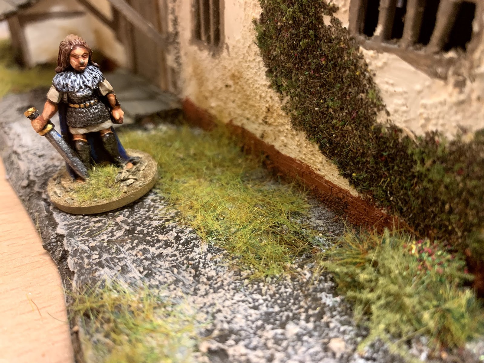 I dug out some Tamiya earth filler to fill some of the gaps where the building wasn’t quite flat on the base, then added three rounds of drybrush, various emulsions „Pain Au Chocolate“, „Mary Jane“ and „Ivory Tusk“. Then it was out with the PVA, multiple shades of static grass and some grass tufts.