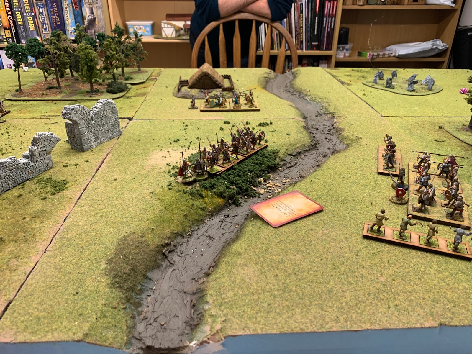 British (Carl) defending a river ford (again) against the Saxons commanded by Myk and Andrew, with AndyH co-refereeing.