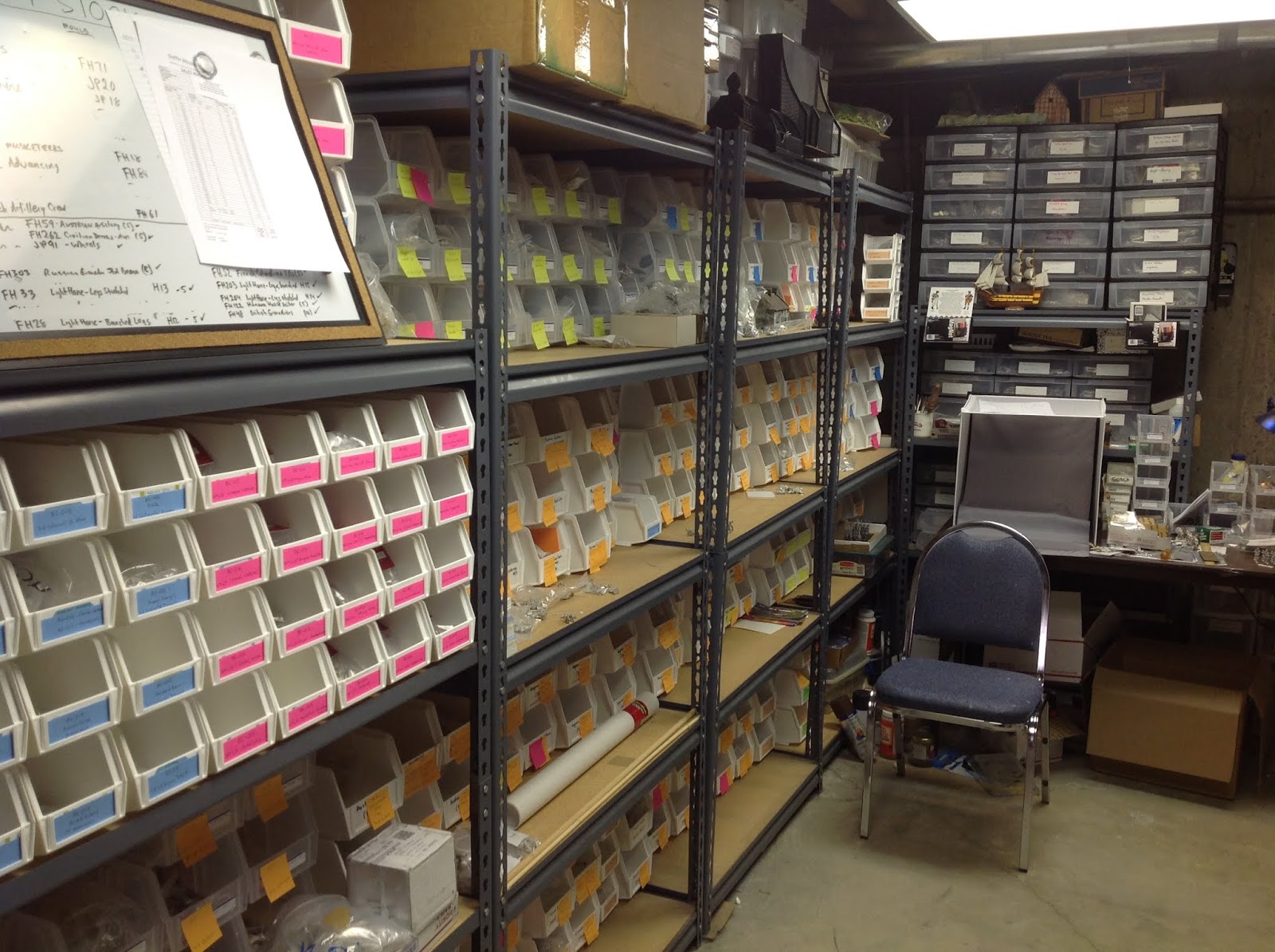 The components bins, shown on the left side of the room, are where I store all of the different castings. Each casting has its own storage bin so that is a lot of bins on hand. Each casting comes from a unique mould ( we have over 500 moulds) , so the mould number is affixed to a label that I stick to the front of the bin. This enables me to easily view the component stock so that I can re-order casting inventory that is dwindling down. The idea is to order the castings and have them in stock before the finished goods packs are out of stock. SEE PICTURE BELOW: