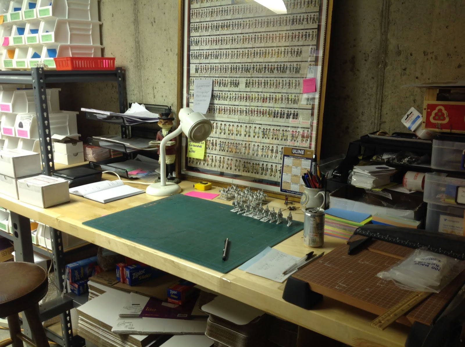 There is nothing interesting or spectacular about the packing table, where the orders are boxed for shipment. Shipping supplies, mostly flat boxes and bubble wrap, are stored beneath the packing table. Sometimes I use this surface for preparing figures that I use for painting my own figures, which explains why there is a cutting mat on the table surface. The guillotine, err paper cutter, can be seen on the right.