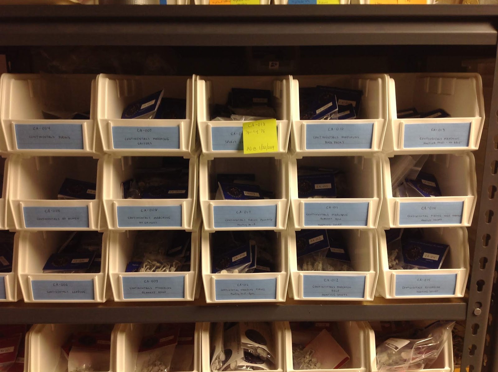 The great advantage of using this open bin system is that it is easy to see how much finished goods inventory is on hand. If I see that an item is getting low in the bin, then I can make new figure packs and replenish the supply.