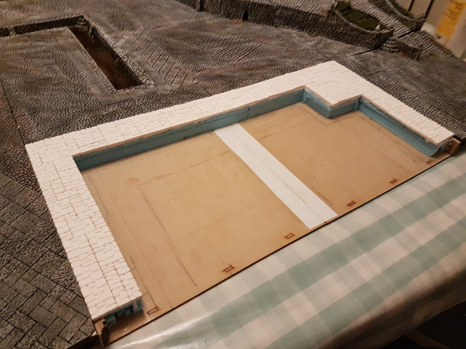 Tonight, with all that in place I’ve added the cobblestones to the top of that. I put it in place with some of the existing boards in attempt to get everything lined up. Unfortunately I am still going to have to sand the edges in some places to make it fit.