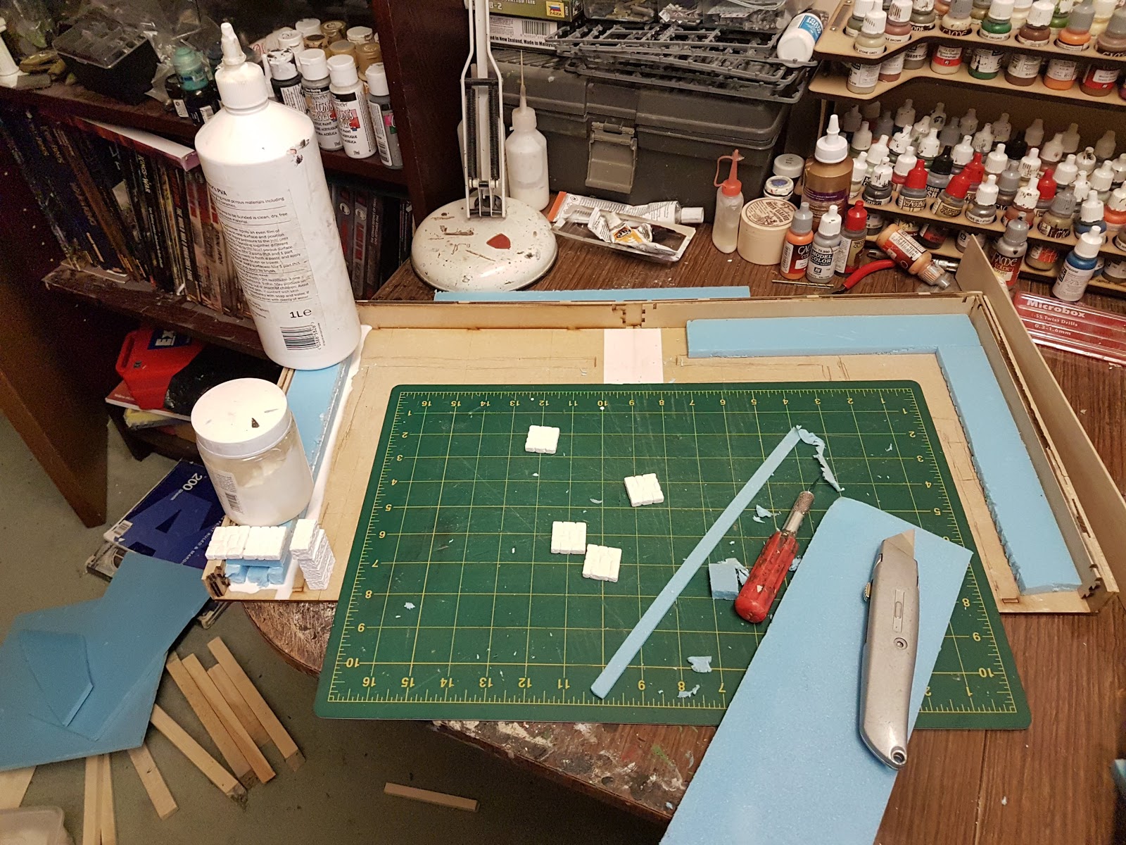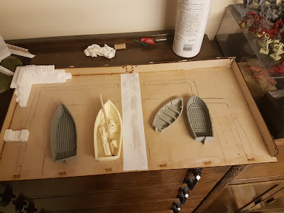 Finally tonight I started work on the walls of the docks. In order to keep them straight I’m building these up on an acetate sheet. I’ll have to lift these off when they’ve dried and the they should slot in place nicely. Maybe that’ll be tomorrow…