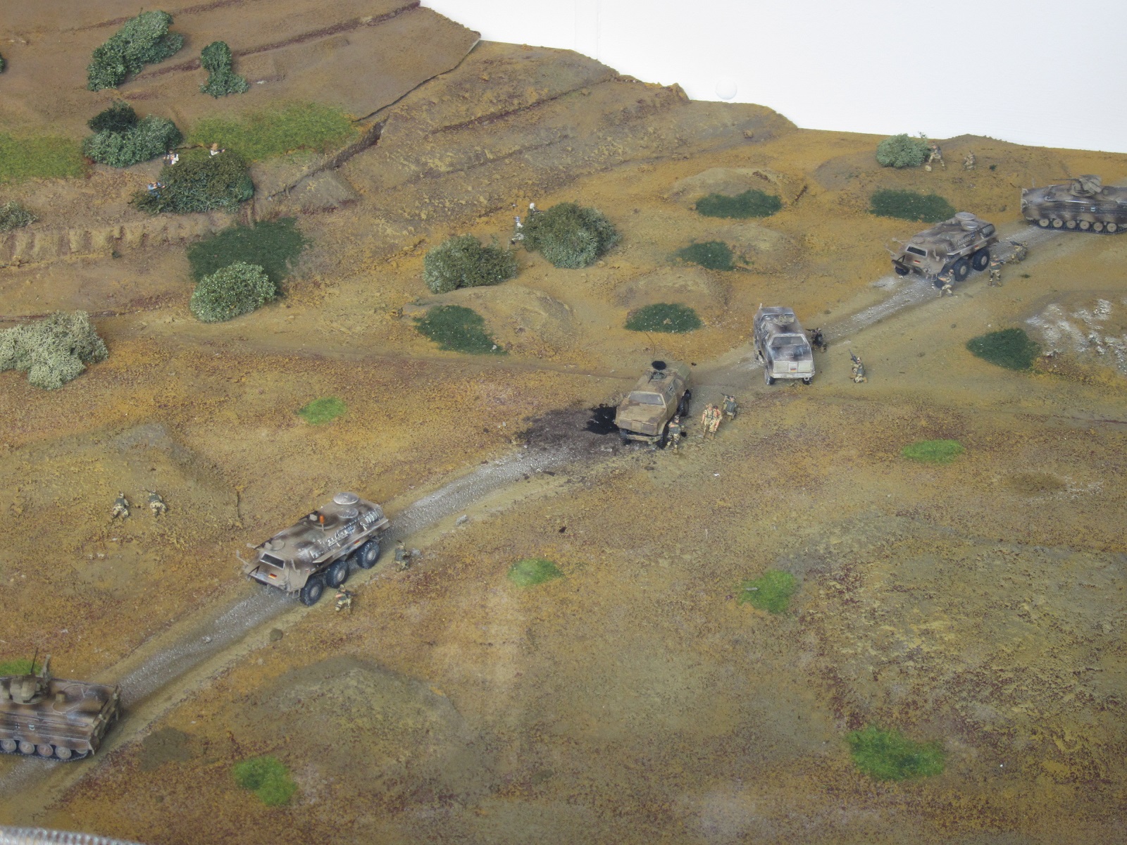 Der eine Dingo ist offensichtlich auf eine Minensprengfalle gefahren. Dadurch ist der Trupp in zwei Teile zerrissen.