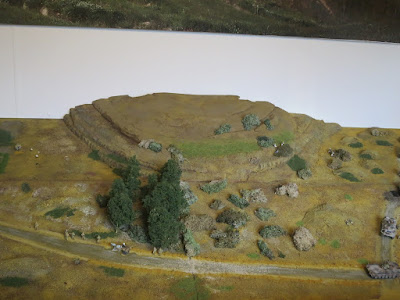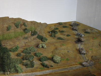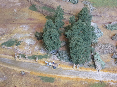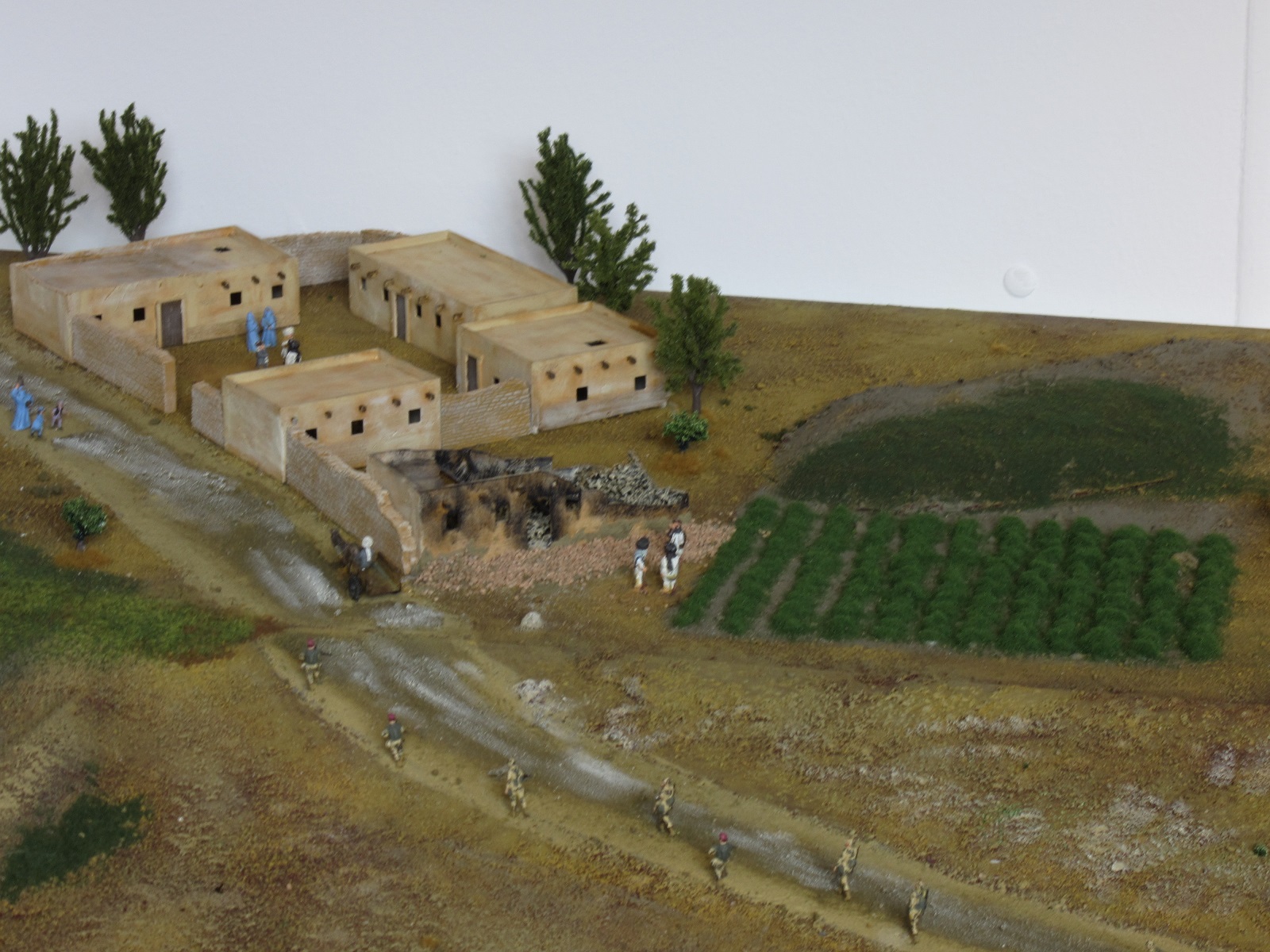In the middle of the diorama, just below the modeled hill, part of the patrol begins to control the first civilians, here in the form of another donkey cart.
