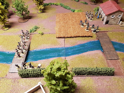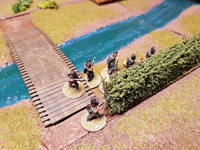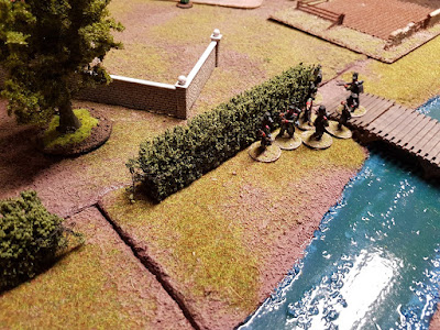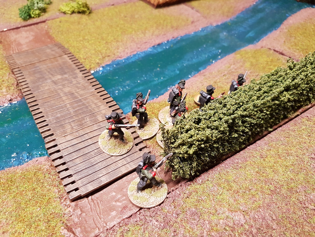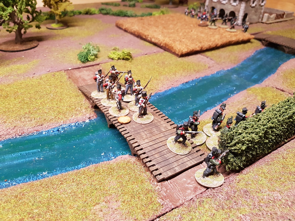 Die Briten eilten im Laufmarsch über beide Brücken, um in den Schutz der Hecken und des erhöhten Flußbetts zu kommen.
