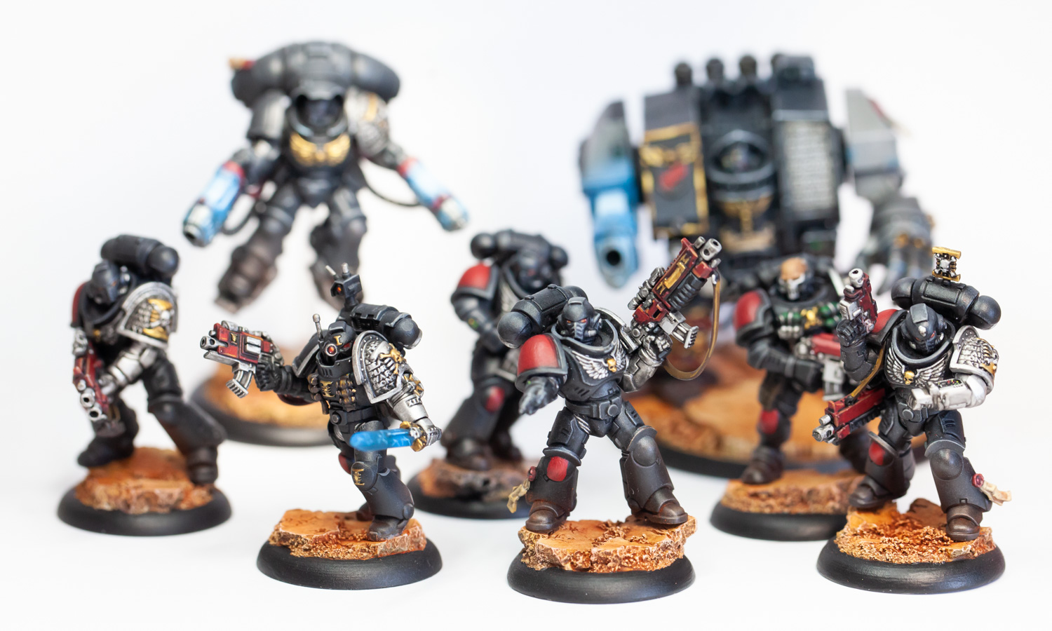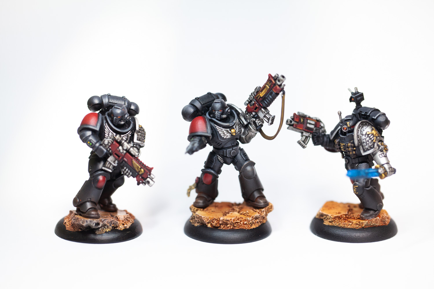 Grundierung in Armypainter Grau, Basecoat in schwarz und ein grobes Highlight in grau mit der Airbrush, der Rest wird mit dem Pinsel erledigt. Genutzt werden nahezu ausnahmslos Vallejo Farben. Grundsätzlich bin ich für die recht lange Pause zufrieden mit den ersten Ergebnissen. Der Kontrast von Highlights zur Grundfarbe könnte noch deutlicher ausfallen, die Edge-Highlights sind zum Teil unsauber und beim Plasma-Glow habe ich es vielleicht ein wenig übertrieben. 😀 Die Veterans würde ich zudem gerne noch mit ordentlichem Weathering versehen damit sich sich von ihren frisch gezüchteten Primaris-Brüdern abheben.