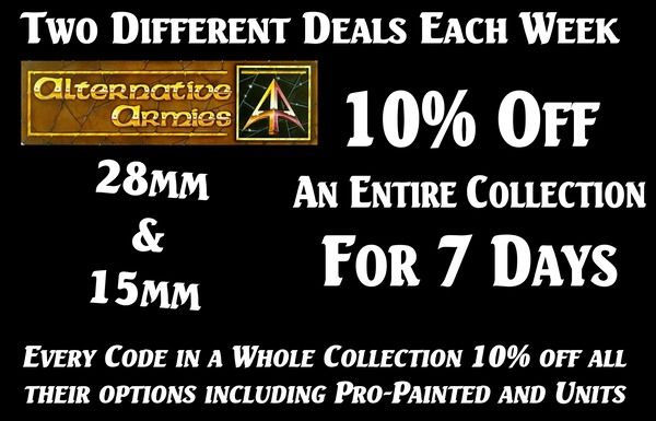 Alternative Armies has a brand new Weekly Deal system for 2018 which began this week! Go HERE or read on for more information.