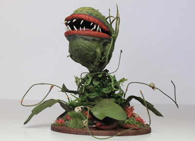 A rummage through the bits box unearthed some suitable macabre remains and I drilled out a couple of plastic skulls and threaded them along the Audrey II’s terrifying tendrils, hopefully giving the impression that they grown through their victim! This rummage also saw light fall on a couple of Dave Stone’s Amorphophallus Titanium, from his Flowering Amorphophallus pack available from the wonderful ‚Wargames Terrain Workshop‘. Now I appreciate that these are, geographically, a South American species, but I felt lent something to the Lost World feel of the piece and so was happy to oblige them a matching paint job to complete the project.