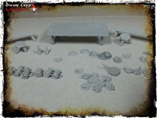 - Commoner Feast Basing Kit 1 składa się z: 5 modeli żywicznych (1 duży drewniany stół, 2 drewniane ławki, 2 okrągłe drewniane taborety) oraz 31 elementów żywicznych z elementami żywności i zastawy stołowej (jedzenie, naczynia, dzbanki, szklanki, miski, talerze, świeczniki).