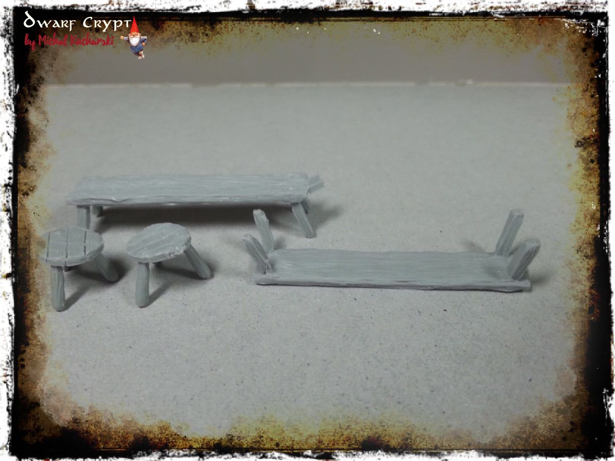 Poniżej zapraszam do zdjęć surowego zestawu oraz pomalowanych jego części. Postanowiłem wrócić myślami na wieś, do gospodarstwa moich dziadków, w którym to pełno było starych ław i stołków o specyficznej, wytartej od lat użytkowania, fakturze.