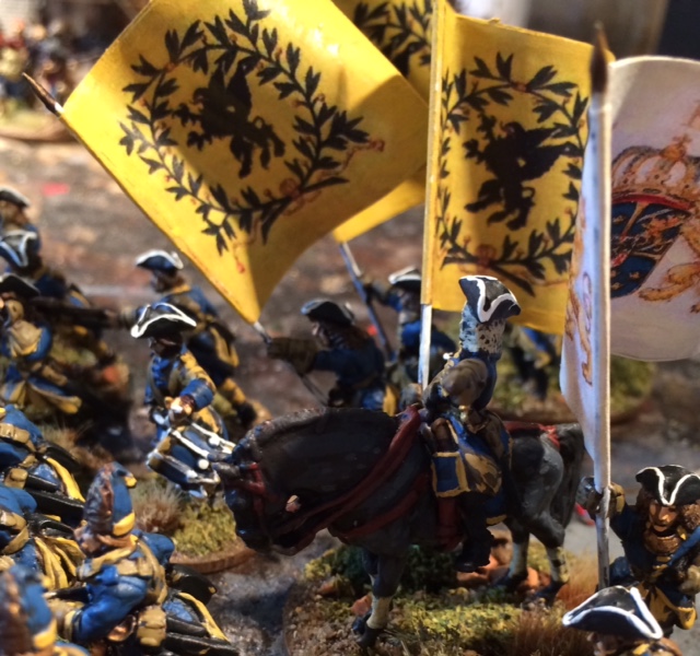 The banners are from the banner drawings that are keept at the Swedish War Archive. The White banner are for the 1st Company and the 3 yellow ones are for Company 2-4 in the 1st Batalion, Company 5-8 in the Second Batalion also had the yellow banners.