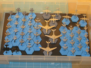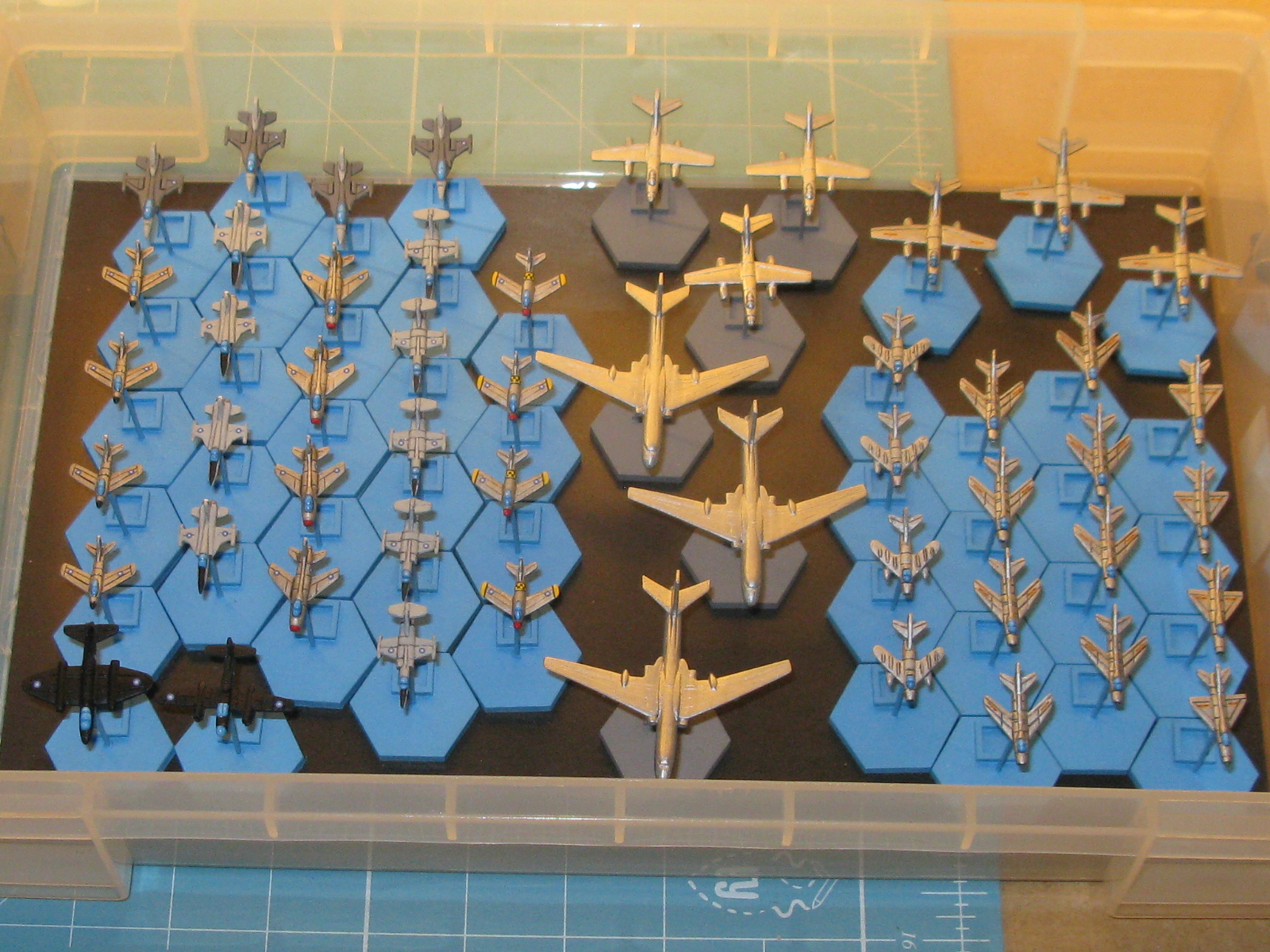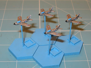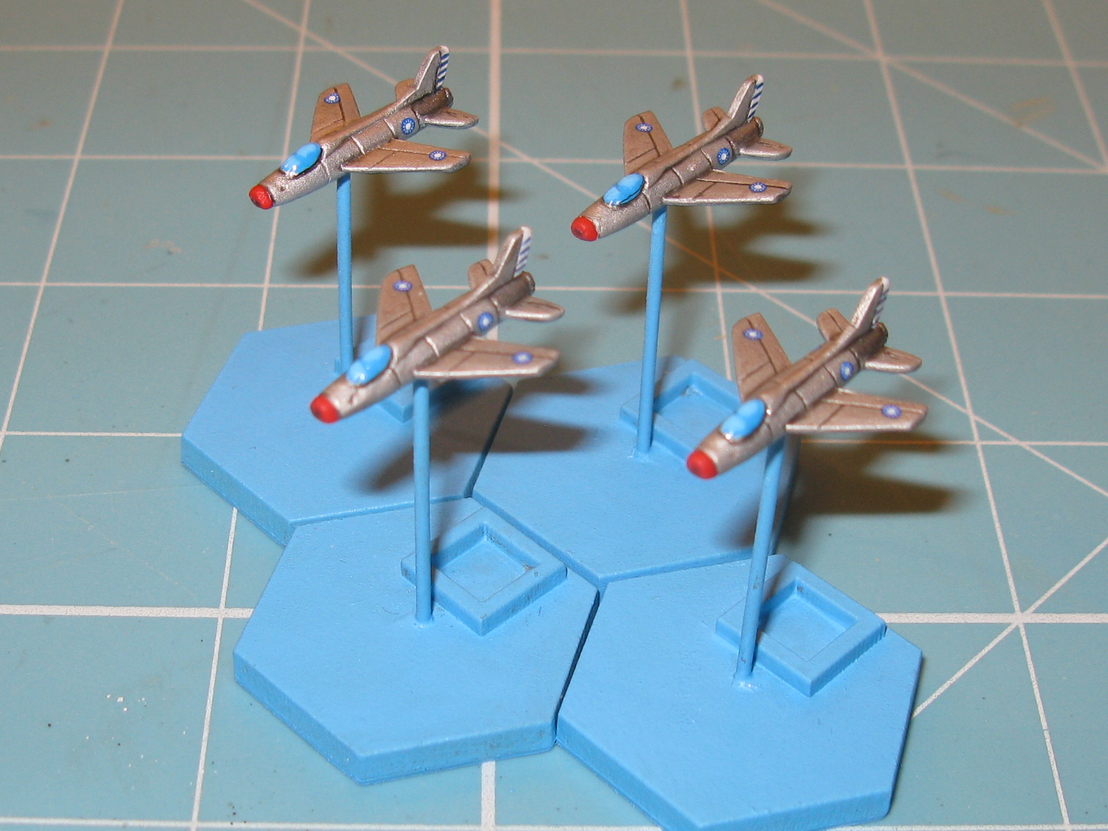 I’m glad to see the back of these 1/600th scale jets, to be honest, as they’ve been hanging around on the workbench for months and have blocked the way to other projects. I finished painting the bases this morning then added the tiddly decals, although I have cut some corners to simplify the insignia for some aircraft as they just wouldn’t fit. Anyway, after a brief varnishing disaster and a quick respray in Army Painter matt varnish to save the day, they are now ready for action. I quite like the way the F100’s and F16’s have turned out, but the F5’s, the F86D’s and the two black night intruders are a bit of a let down, especially after the varnishing mess up on the latter. Never mind, I can now get started on the 1/2400th scale ironclads for 1864. I’m hoping that this will give my eyes a rest and be a little less fiddly?