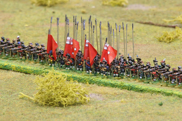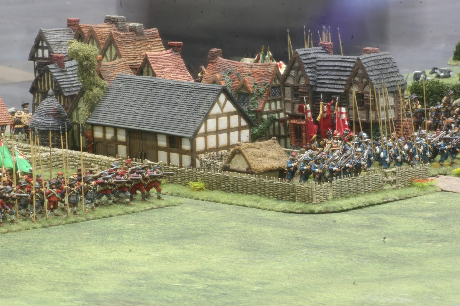Above is Lord Byron, the hard-fighting Royalist cavalry general. Below, Royalists defend a hedgeline. The long grass is from Killing Fields in the USA- a super product which I just needed to cut to fit the fields.