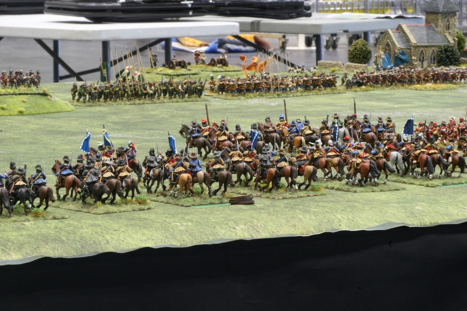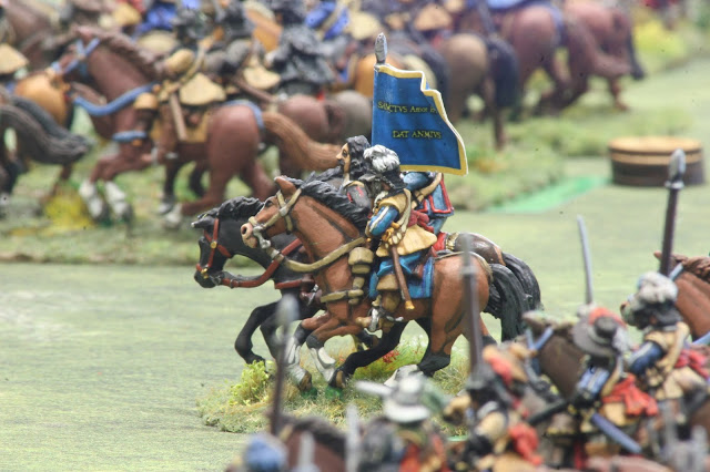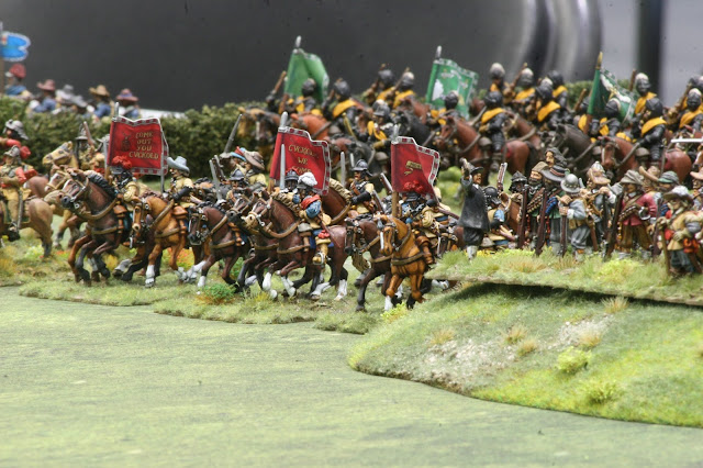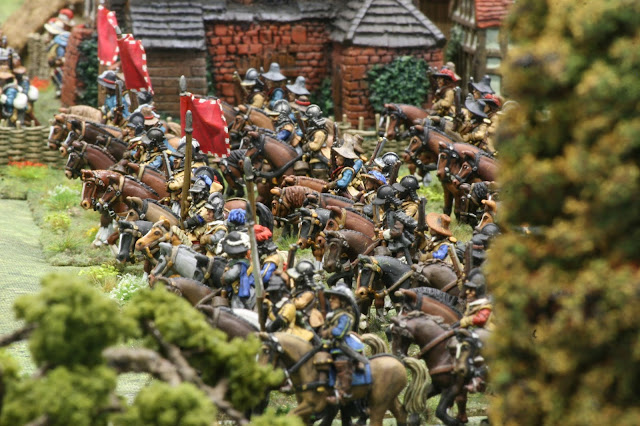 Above are the mass of Royalist horse on the left- mostly Northern horse- with the King’s Lifeguard of Horse to the fore. Below, Parliamentarian horse, with“Lobsters“ to the rear.