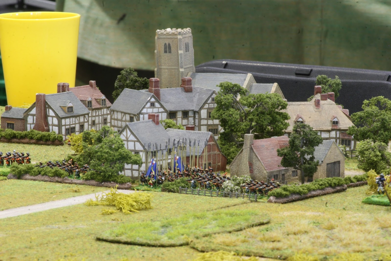 Above- the Parliamentarians eschew the protection offered by the stone wall surrounding the church of Saint Lasiurus Egregius. Below, the villlage of Soggy Bottom is largely composed of 25mm Hovels buildings- which have great character!