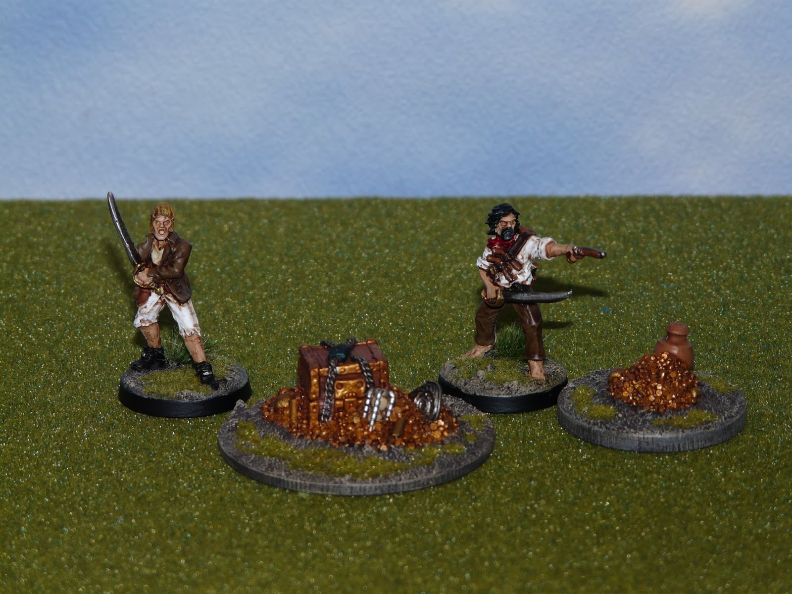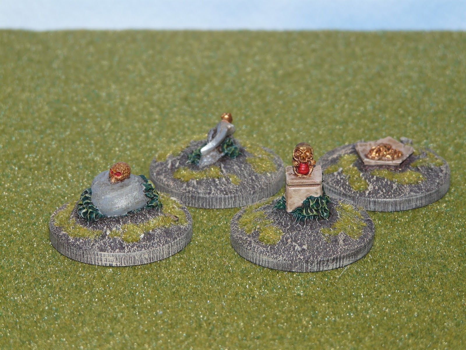 I based each of the treasurers on circular bases which allowed me to add some extra flock and to mix with my existing terrain pieces and protect the edges of the treasure piles which could chip as the pieces are resin.
