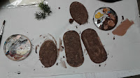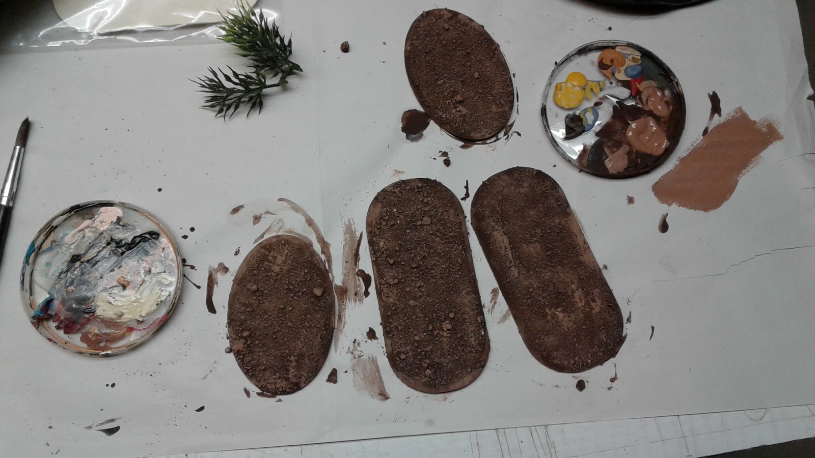 While waiting for ink to dry I prepped some bases. Sand, burnt umber brown and then a lighter brown dry brush.