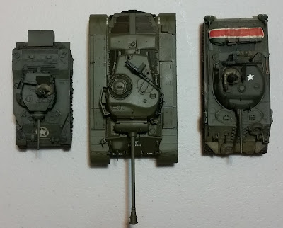 A view from above of the same three tanks. The Pershing was sprayed with a Testors Olive Drab enamel and given a pin wash at the seams, etc. The color is sort of lighter than what I had expected, but there’s a ton of discussion on the „proper“ color of WW2 US Olive Drab – so I’ll leave it as is.
