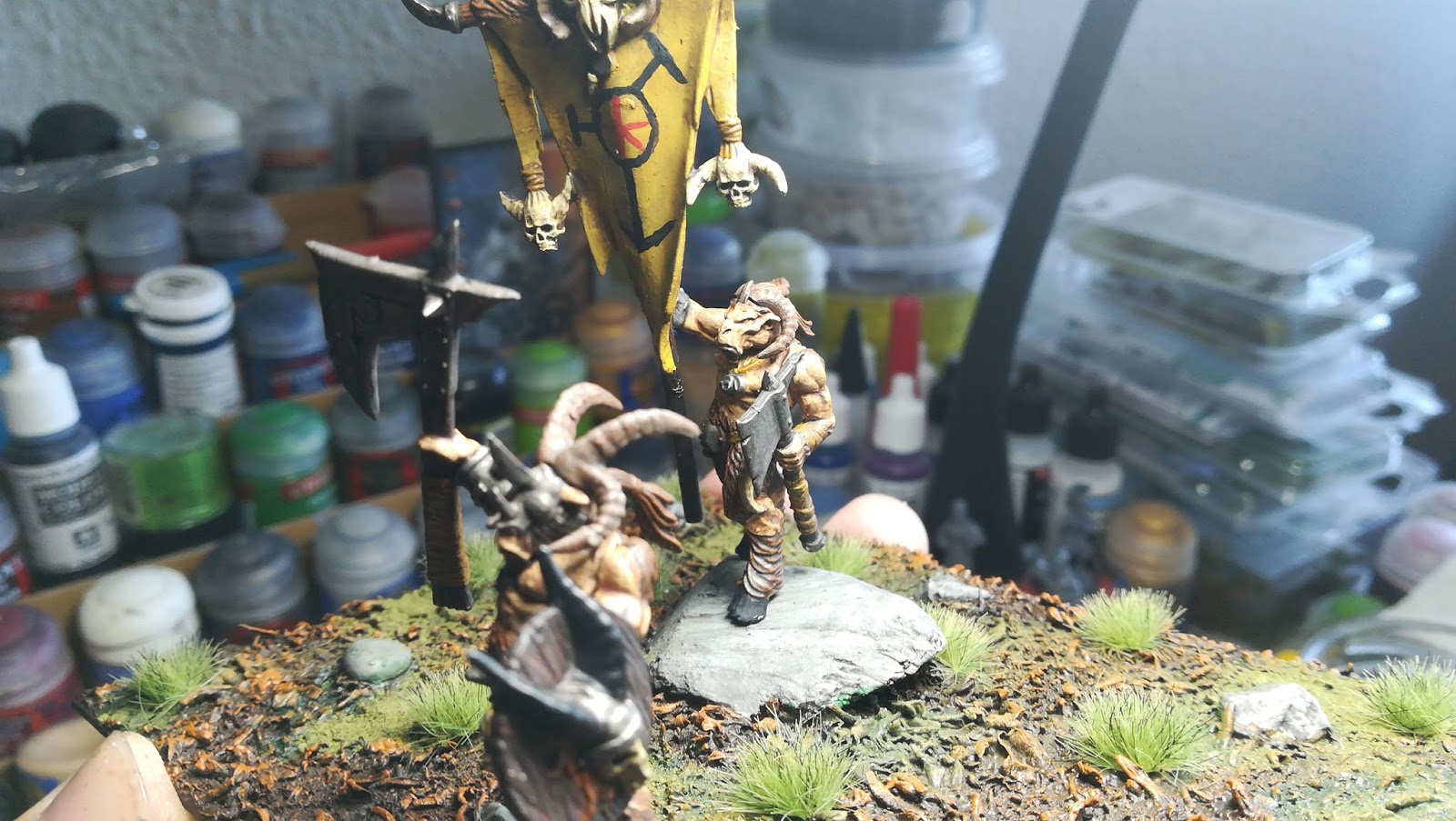 Dunkelelfen und Ratten vielen auch weg. Gerade für letztere sieht mir das Base nicht „rattig genug“ aus. Irgendwann viel mein Blick auf die Tiermenschenboxen und ich dachte mir, „warum nicht?“ passt ja, so Waldboden und die Burschen.
