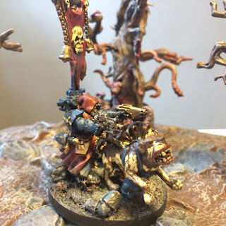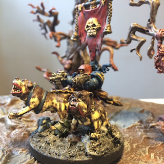 I painted this old Dark Angel mini for my son David as a Commander for his Marines a while back, but he didn´t thought he looked as a leader, so I decided to pimp him up a bit with a banner and some pets. I´m not sure where the dogs are from, as I have had them in my lead mountain for some time.