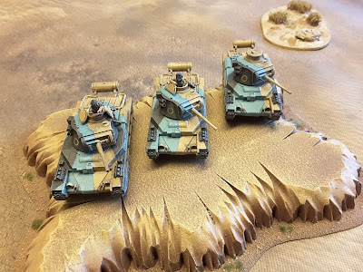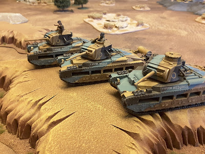 The first three vehicles to roll off the production line are these 28mm Matilda II tanks painted up for my early war North Africa British collection using what regular readers should recognise as my take on the Caunter scheme.