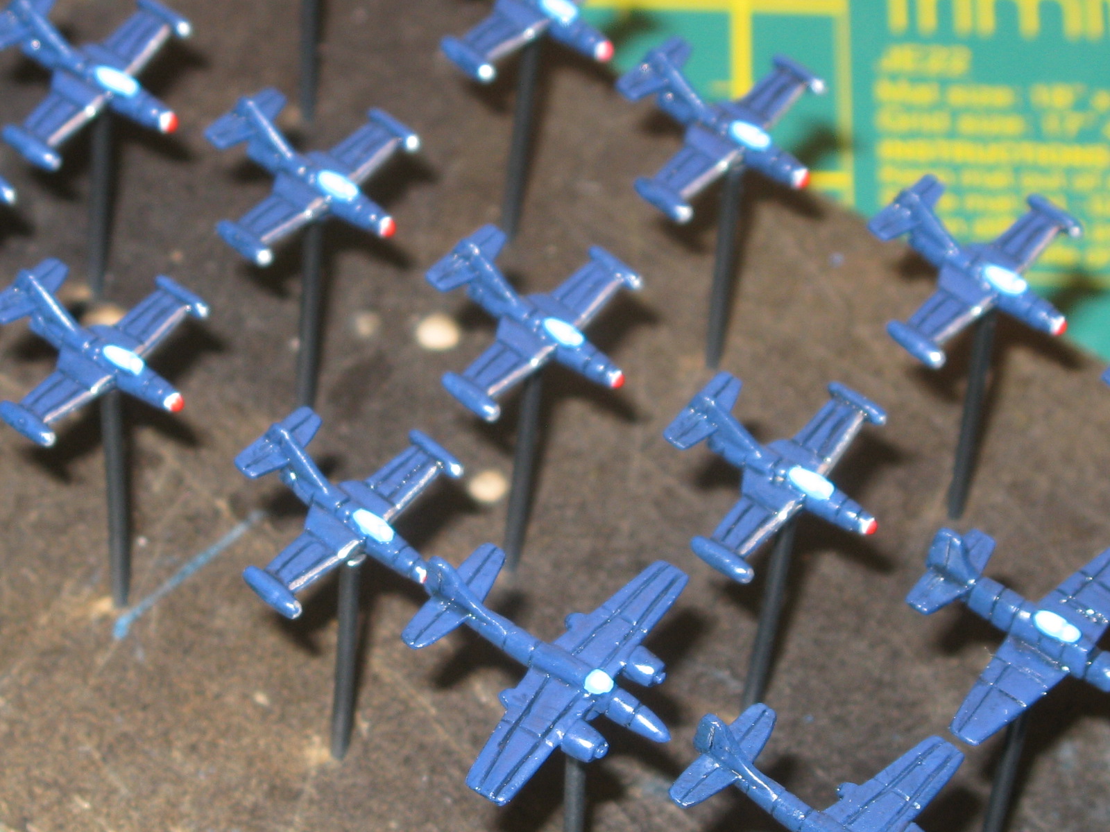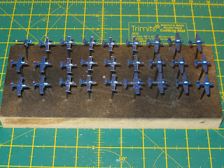 I finally got round to painting the canopies, wing leading edges, fin and nose flashes on the MiG Alley / Bag the MiG naval aircraft today, after over a week of delay. The canopies were easy but the anti-corrosion leading edge on the F9F Panthers was a bit of a pain and needs some tidying up to look neater. The aircraft are now almost ready for the decals, apart from some black lining with a 0.05 drawing pen, which tends to make them look a lot better than the basic paintwork would otherwise suggest. I’ll try to get time to do at least some of the decals over the week, as I have now got some tiddly white lettering to add to the wings and tail fins, albeit in a much simplified format.