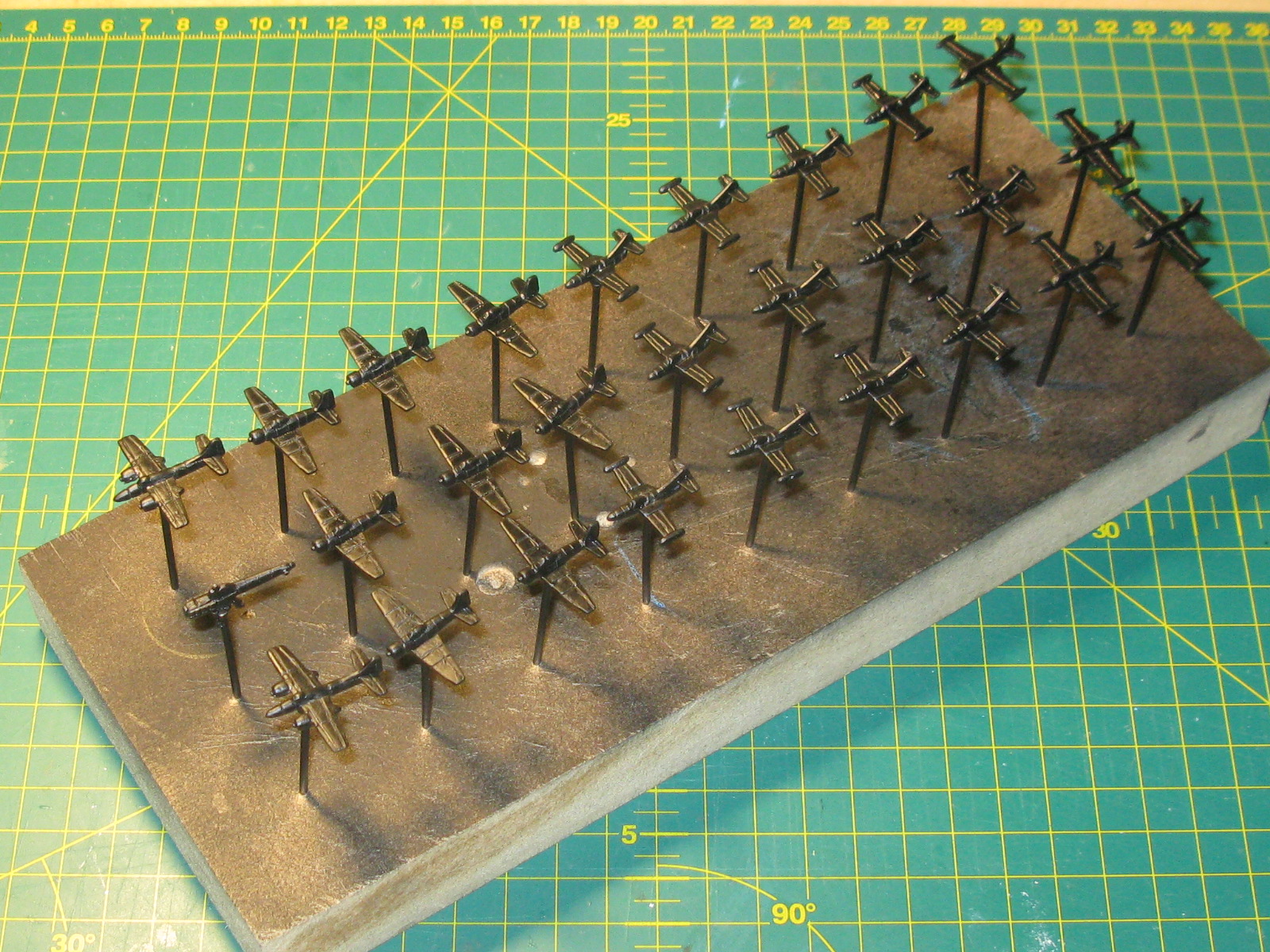 I’ve knocked together a new painting rig for the 1/600th scale projects, using an old block of mdf and some 40mm panel pins, so it should be a lot easier to get the production line working smoothly. I’ve also decided to do the USN / USMC aircraft instead of the MiG’s as the Panthers and Banshees are so cool. I couldn’t fit the Corsairs onto the painting block, so they’ll have to wait, but there are Skyraiders, Tigercats and a single helicopter in addition to the fighter bombers. When the undercoat is dry, they’ll all get a heavy basecoat of Vallejo Dark Prussian Blue, which is the closest shade I could find for the USN dark blue used in Korea. I also have to bite the bullet and get on with the decals for the Sabres, Shooting Stars and Thunderjets, although I’m not looking forward to that!