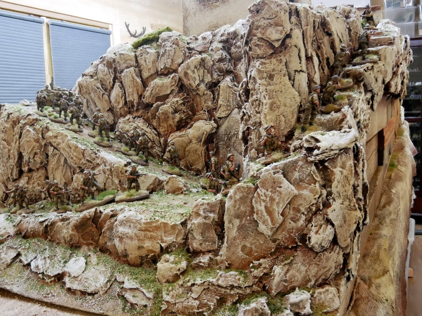 The eye-catching terrain at Salute was made by the very talented David Marshall of TM Terrain who commissions work at the highest diorama level (he did the Perry’s Agincourt terrain for the Tower of London) and so I have based my poor man’s wargaming version of a Monastery and bridge over a ravine but I extended the mountain to run the full length of the 10ft table which has enabled me to build a village on top.