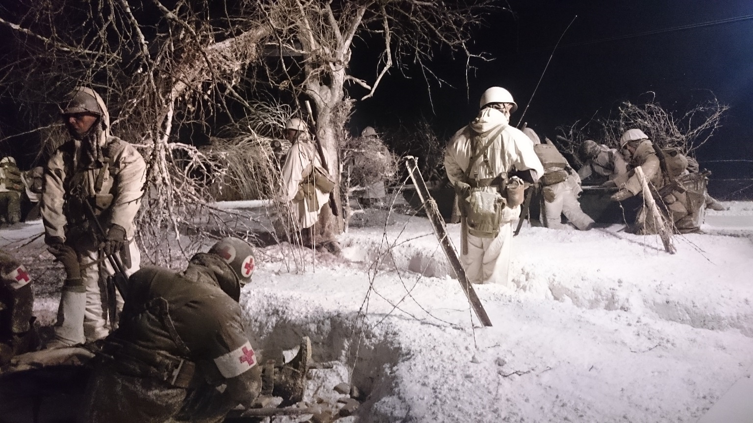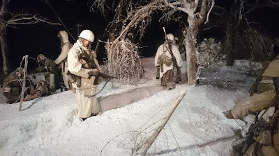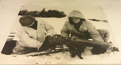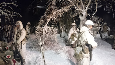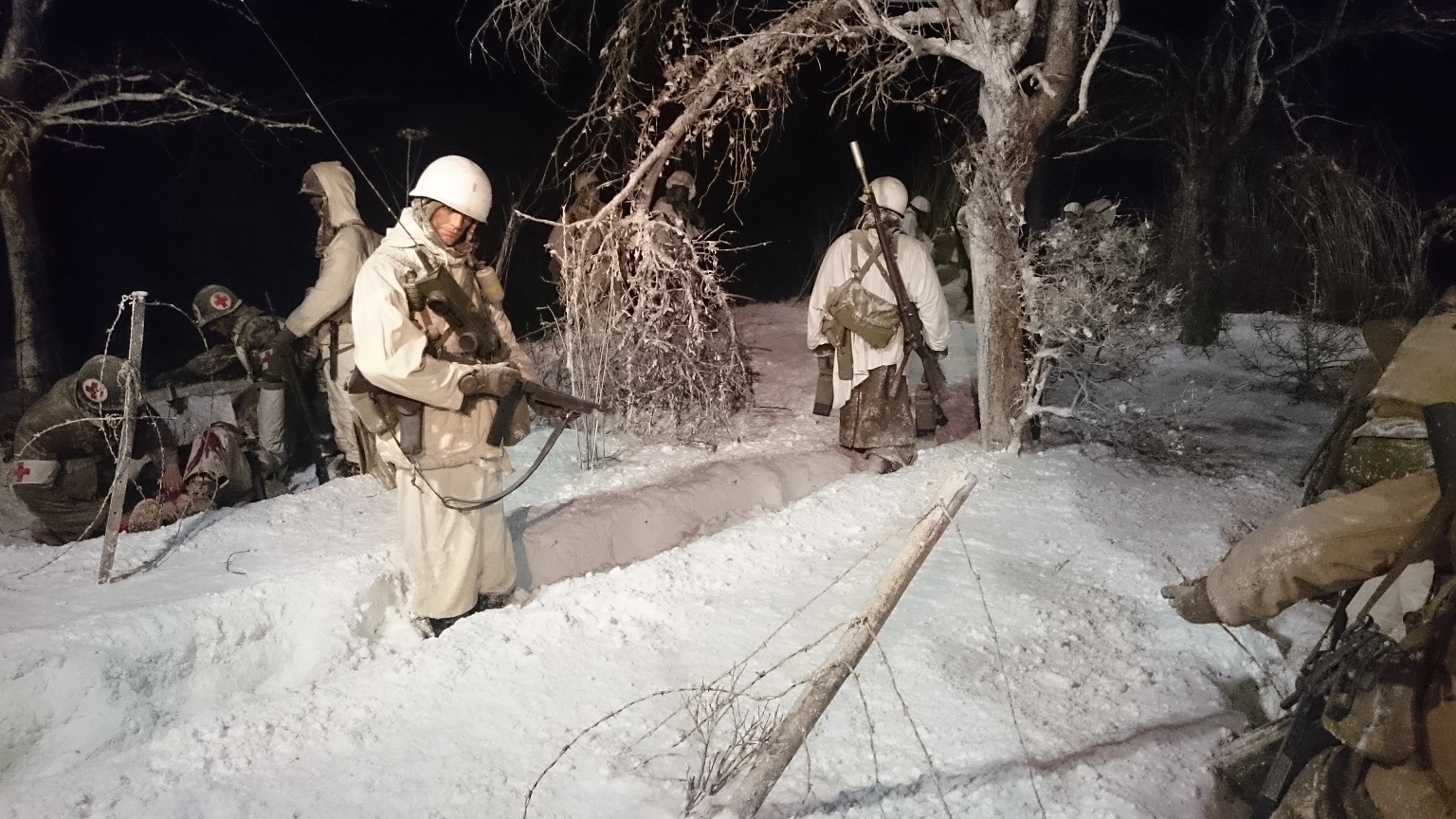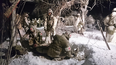 All soldiers wear winter camouflage clothing. The detective, who hands a message to the baron, is wearing suede boots worn over the boots to protect the snow. One still sees an officer (furry cap), a paramedic and a post beside the detector at the entrance. The inscription in Sütterlin – Old German language – is a slogan of propaganda and means: „Nevertheless, we are victorious!“