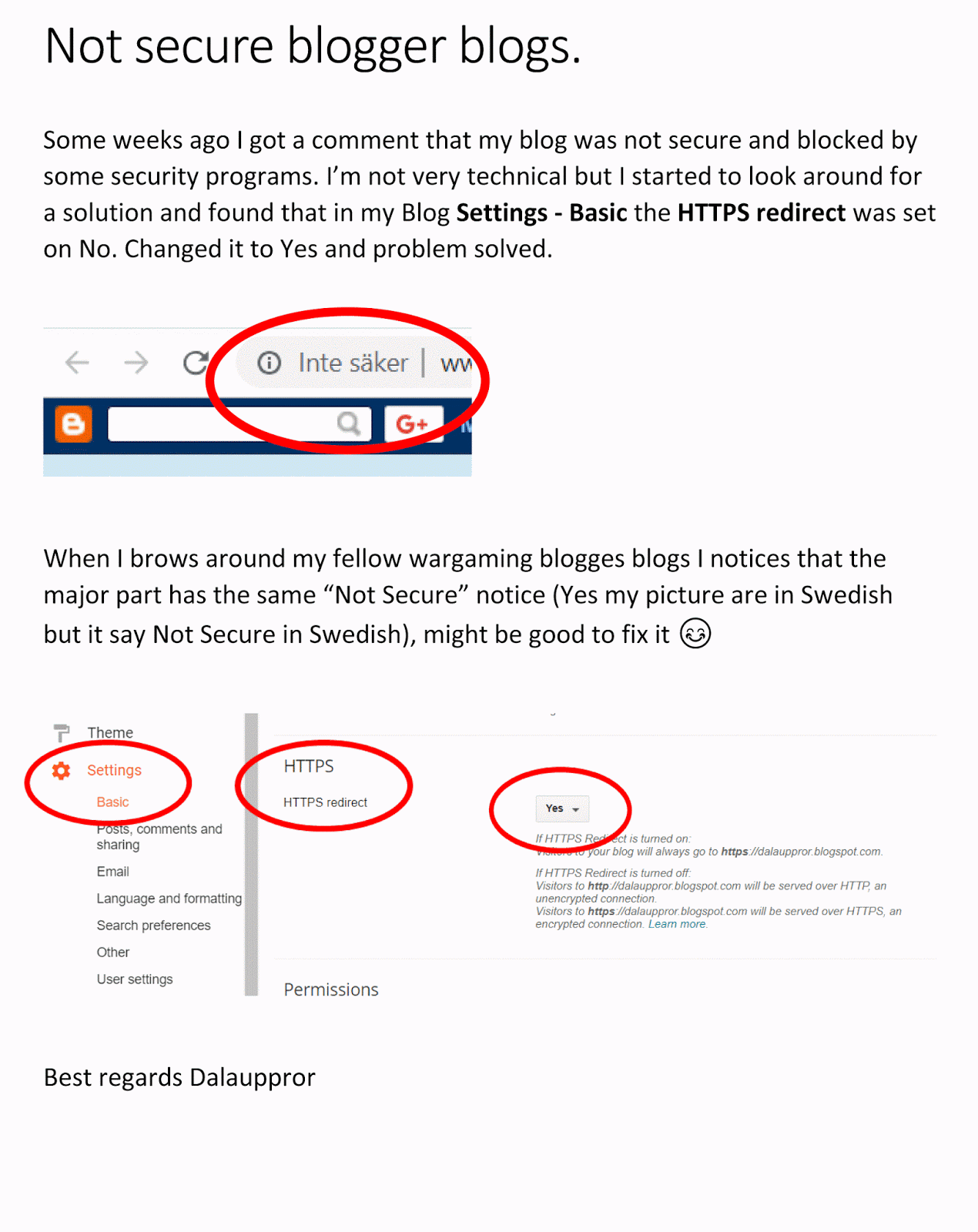 Some weeks ago I got a comment that my blog was not secure and blocked by some security programs. I’m not very technical but I started to look around for a solution and found that in my Blog Settings – Basic the HTTPS redirect was set on No. Changed it to Yes and problem solved.