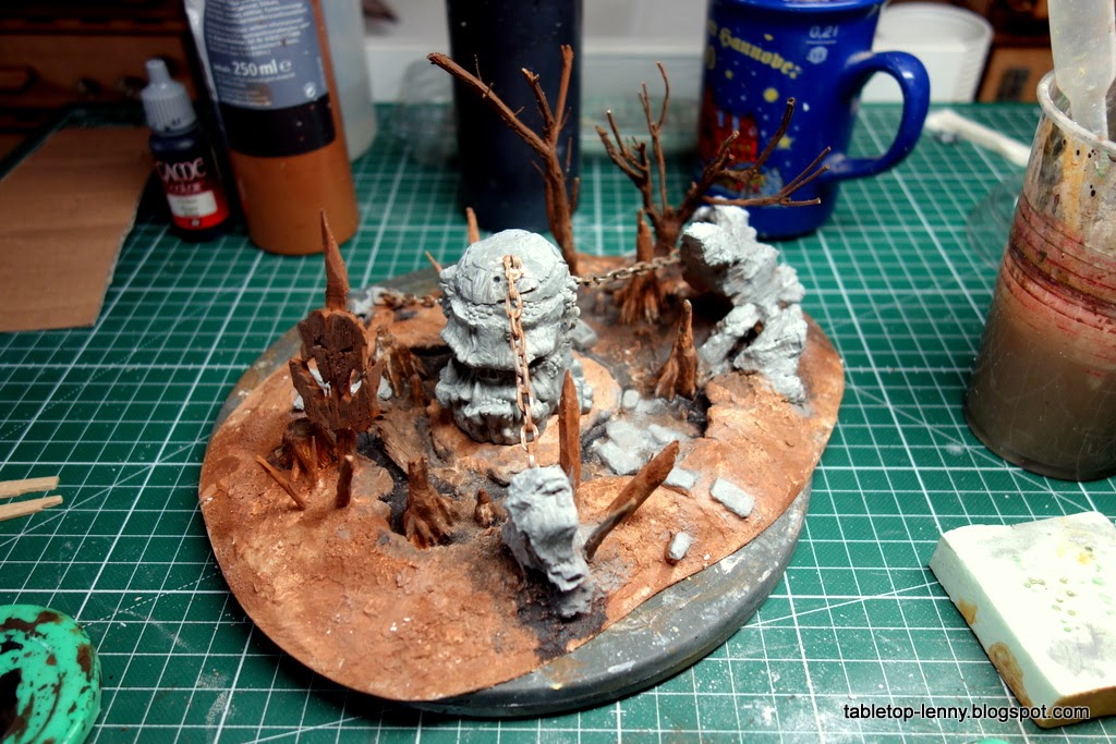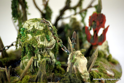 Deutsch: Zur Sicherheit hab ich die Statue noch mit Ketten an Magneten gefesselt. Als Ork-Schamane muss man sicher gehen, dass das Ding nicht zum falschen Zeitpunkt aus dem Sumpf auftaucht. Das orkige Banner habe ich aus Balsaholz ausgeschnitten.
