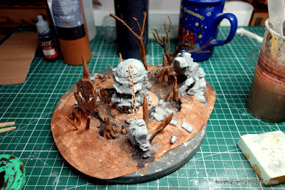 This is the foundation that I use for most terrain works. 3-5 mm MDF-Wood, foam, filler and air drying clay. I used cork bark for the rocks and a few of my swamp tree casts. And of course PVA.