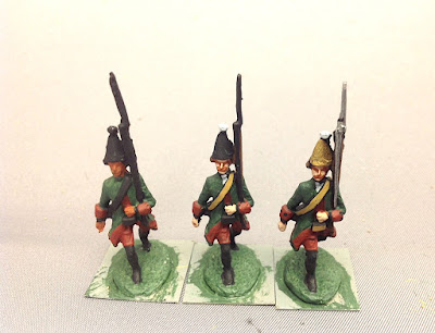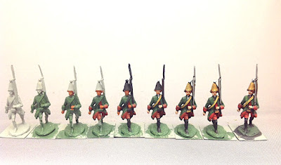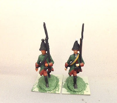 I have added red highlights to the breeches and waistcoat and cuffs and some green highlighting on the coat. The belts have some leather highlights too. I used to add wood grain to musket stocks but I stopped doing that because nobody is going to see the wood grain anyway.
