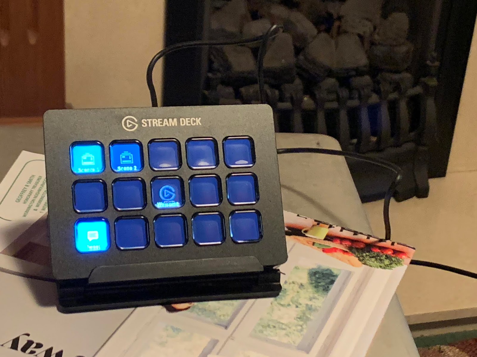 Basically, it has 15 completely configurable buttons with individual colour displays, and the idea behind it is you can customise it for your own gaming or streaming video, or whatever, setup to replicate arbitrary key presses, do scene/camera changes, send Tweets, etc etc…