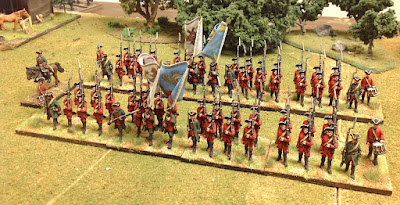 You may have noticed that I have gone to a different basing system for my SYW army in order to move the figures closer together, shoulder to shoulder, if you will. The battalions now have 32 figures on four stands compared to the old system of 30 figures on five stands. The two end stands have 9 figures each, with the drummer deployed out on the flank. The two center stands have 8 figures each.