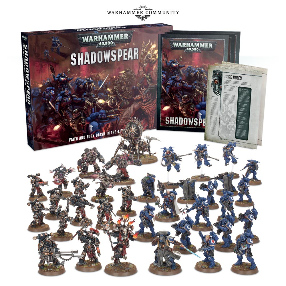 Games Workshop hat das neue Spiele Set für Warhammer 40.000 vorgestellt. Bei „Schattenspeer“ treffen die neuen „Vanguard“ Marines auf die neuen „Deamonkin“ des Chaos. Beide Armeen kann man direkt aus der Box Spielen, da sowohl ein Regelwerk als auch neue Codex Bücher mitgeliefert werden. Zusätzliche findet sich noch ein Kampagnen Buch im Set. Erscheinen wird das ganze am 16.03.2019 für 135€.