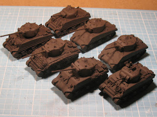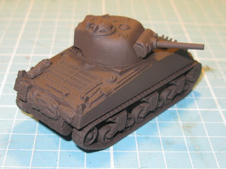 I’m a bit tired of gluing together Sherman’s, so here are the last two that I have completed before moving on to the tank destroyers and light tanks. The first is a standard M4A3 (75) using an Armourfast turret with PSC commander on an Italeri hull. The second is an M4A3 (105) also using the same mix of Armourfast turret and Italeri hull. I have a second one of these in the box but no more Italeri bottom halves, so I may make it with the Armourfast hull but add Early War Miniature sandbag armour to cover up the lack of detail. In the meantime, it’s on to the TD’s!