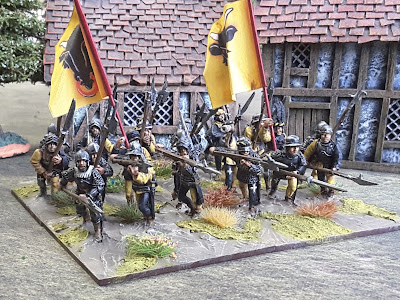 I have based these on my standard 60 x 50mm base for the period but have used 6 figures a base rather than the 8 per base I used for the pike, I have staggered the figures on the rear rank so that the are visible behind the front rank when looked at head on. I much prefer this to basing the ranks directly behind each other, it gives a much fuller look.