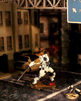 Das Gelände ist dieses Mal weit mobiler als sonst. Was ich bei Batman für meine Polizei schon besitze, muss auch im Cyberpunk-Setting her. Ein Helikopter! Dieser passt aber nur mäßig und die Serienmodellen sind in der Größe nicht zu bekommen . Also vielleicht doch lieber etwas mit Triebwerken! Sinn macht er zum Spielen keinen aber er zieht das Bild viel mehr in die dritte Dimension, wenn er über der Platte schwebt. Irgendwie müssen die schweren TAGs und Infanteristen ja auch schnell zum Einsatzort gelangen.